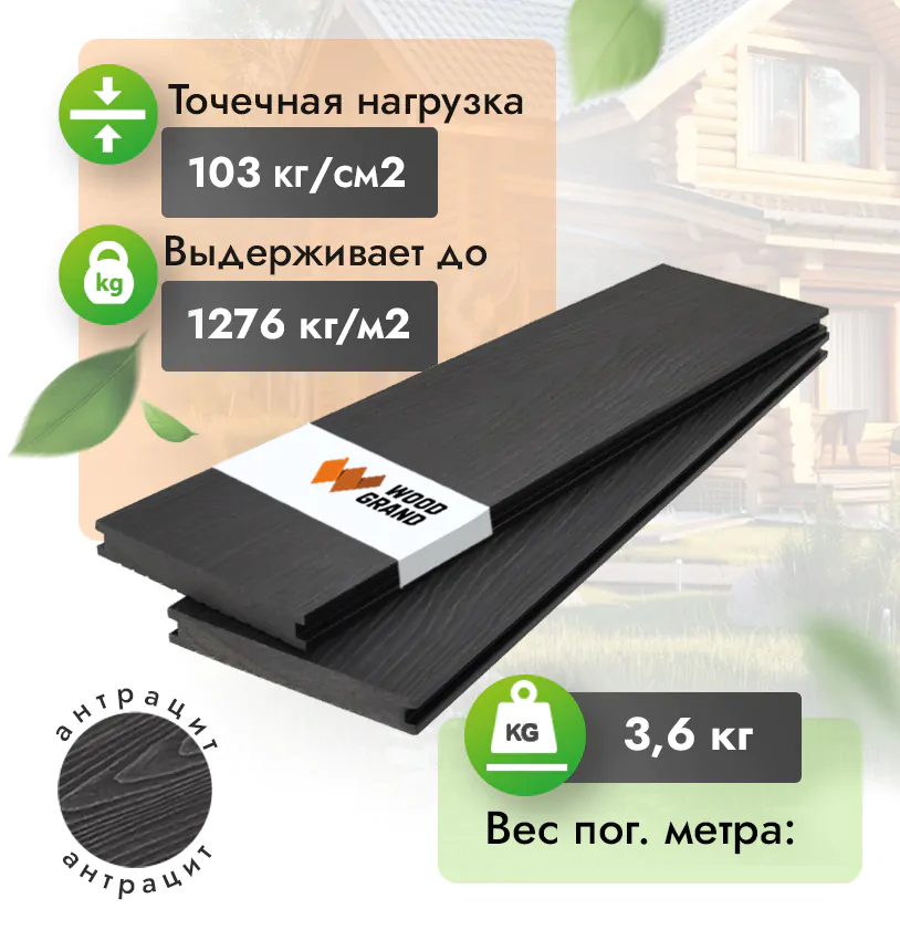 Наша террасная доска из ДПК выдерживает до 3318 кг/м2, влагостойкая, не требует ухода.
